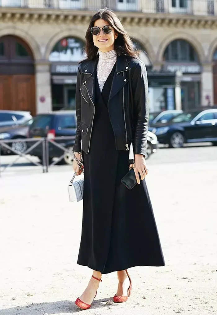 Элегантное сочетание — черный джемпер-водолазка и кожаные брюки, подходит для девушек, которые любят различные повседневные образы. Преимущество этого лука в том, что он прекрасно визуально корректирует силуэт, скрывает недостатки и проблемные зоны и просто стройнит силуэт.