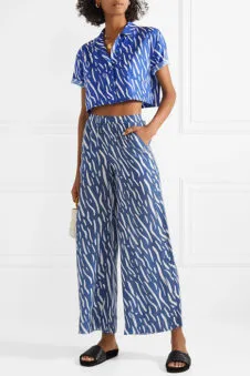 С брюками светлых тонов хорошо смотрятся цветочные узоры, а вот сверху с животными мотивами лучше избегать. Это выглядело бы слишком претенциозно. Исключение — традиционная черно-белая зебра. Особенно выгодно смотрятся блузки и блузы с цветами в оттенках маиса, кобальта, горчицы и розового. Наличие листвы на отпечатке является преимуществом. Классические узоры — полоски, горошек — подходят как для темных, так и для светлых оттенков синего. Если есть сомнения, блузку с таким рисунком следует уравновесить однотонным пиджаком.