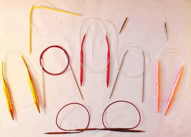Круговые спицы — это две вязальные спицы, соединенные леской или проволокой. Как и прямые спицы, они различаются по материалу, диаметру и длине. Для круговых спиц длина шнура также является важной характеристикой. Наиболее распространенные длины — 40 см, 50 см, 60 см и 80 см.